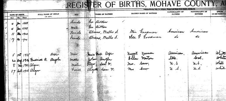 Angle, Ray - born 1 Nov 1913 in Chloride, Mohave, to Ellen M Weston and John Angle