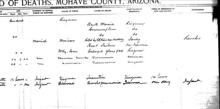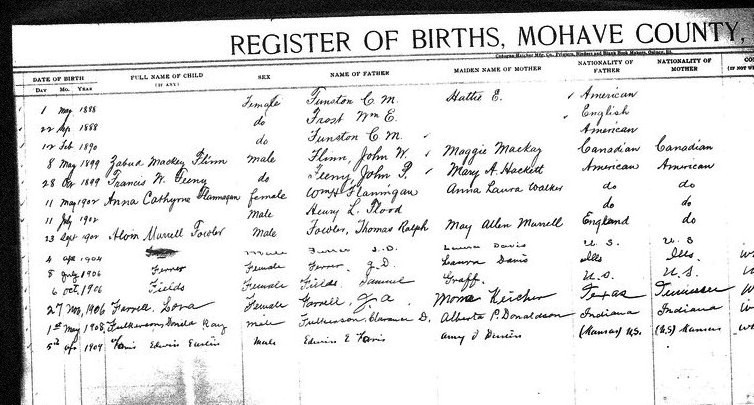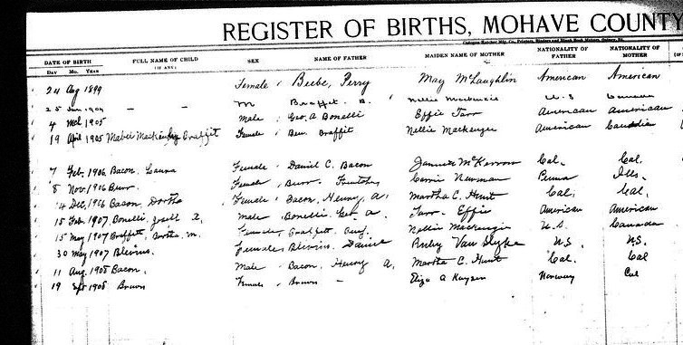Braffett, Virgie B - born 3 May 1911 in Kingman, Mohave, to Benj Braffett and Nancy Mackendie