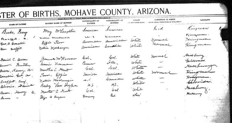 Bacon, __ - born 13 Mar 1910 in Hackberry, Mohave, to Henry A Bacon and Martha C Hunt