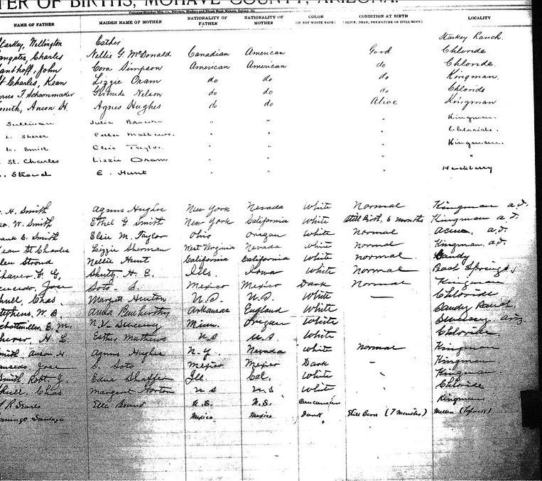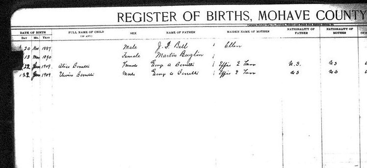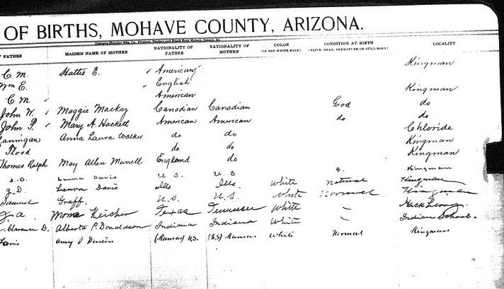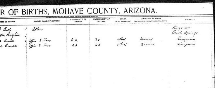 Bartlett, __ - born 19 Aug 1911 in Chloride, Mohave, to Ettie Race and Archie Bartlett