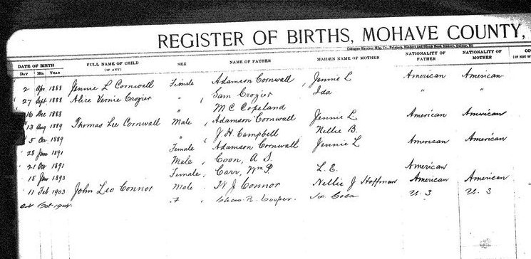 Cornwall, Anna Lee - born 15 Feb 1915 in Kingman, Mohave, to Ida May Stephens and Thomas Lane Cornwall
