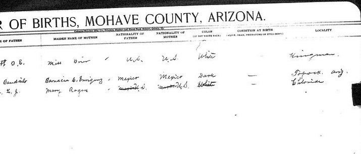 Salazar, Senona - born 12 Apr 1914 in Mohave, to Juana B Salazar and Felis R Salazar