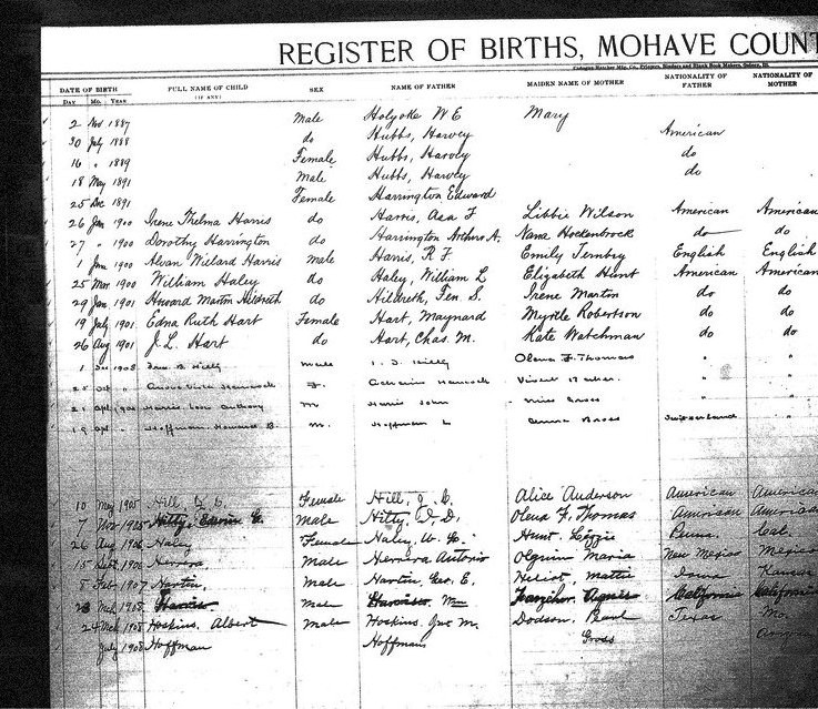 Barnes, Frances Alma - born 16 Jan 1914 in Kingman, Mohave, to Horace Irving Barnes and Bernice Arno Hilty