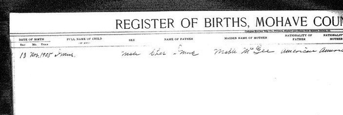 Smith, Melvin Gayle - born 27 Mar 1910 in Kingman, Mohave, to Grace Gertrude Kenson and Alfred Smith