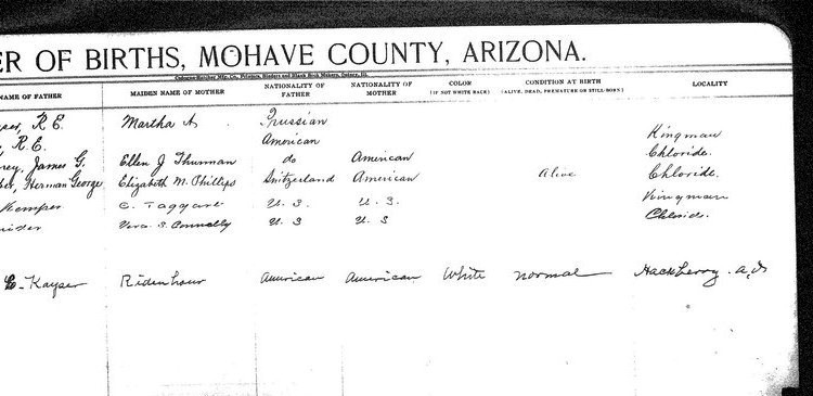 Dickie, __ - born 5 Aug 1913 in Goldroad, Mohave, to Edward H Dickie and Clara Toltz