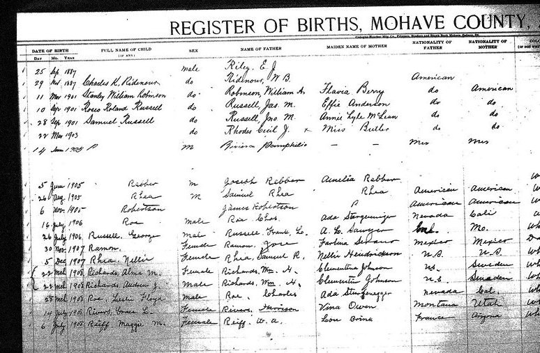 Russell, __ - born 12 May 1913 in Kingman, Mohave, to Frank Lee Russell and Anna Laura Sawyer