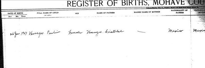 Avalos, Vevia Elvira - born 14 Jul 1912 in Mohave, to Esther Avalos and Maximo Avalos